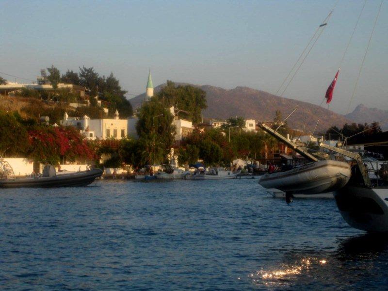 Dann erleben wir die Überraschung: In der begehrten Marina der Stadt BODRUM ist ein Liegeplatz frei für eine Nacht! Die Wäsche wandert gleich mittags zur Laundry, das ist ein Super-Service und verschönert das (hygienische) Einfach-Leben an Bord. Großeinkauf im nahen Supermarkt, der einen enorm großen Umsatz macht beim Charter-Wechsel am Wochenende. Viele lassen sich alles ans Schiff liefern, Unmengen von Wasserflaschen, Alkohol, Chips, Melonen, Fruchtsaft, Cola, Fanta, Spaghetti, Konserven. Unvorstellbar. Vielleicht kaufen die ja nie ein. Wir finden dagegen in ganz kleinen Läden so manches, was wir so nebenbei „entdecken“: Eine stabilere Chromstahl-Solar-LED-Ankerleuchte, die keinen Bordstrom vertilgt und nun am Heck im Achterstag „von selbst leuchtet“ an Ankerplätzen, einen kleinen LED-Leuchtkörper, ein Kabel, das könnte doch eine Leseleuchte fürs Cockpit werden? An Bord baut der Elektriker a.D. Gerhard eine Pendelleuchte und ich hab die Idee, dass der abgeschnittene obere Teil einer türkischen ERIKLI-Wasserflasche doch als Schirm dienen könnte. Ein (in Bremen mal gefundenes!) Taschentuch bekommt in der Mitte einen Kreuzschnitt und wird über den ehemaligen Flaschenhals gestülpt, festgebunden am Gewinde, unter dem Kabel: Fertig ist unsere Hängelampe, die nun an den schon um halbacht dunkel werdenen Abenden am Großbaum baumelnd den Cockpittisch erhellt, sogar die neue FAZ kann ich nun abends lesen. Und speisen im Dunkeln klappt nun auch noch „draußen“ nach 8 Uhr abends.