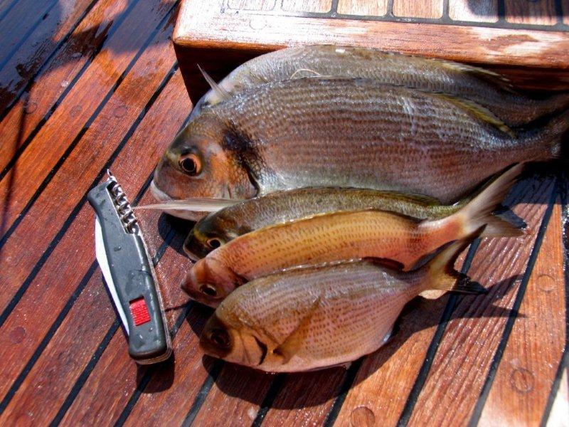 Früh am 31. August tuckern wir rüber zu der nahen Fischfutters-Verladestation und der Skipper schwimmt mit an den windschiefen Anlegesteg. „Balik? Fish?“ – „Hayer!! No!“Aber ein Brot können wir haben. Der Arbeiter war 20 Jahre lang in der Schweiz – als Bäcker!! Und dann haben wir Glück: ein Fischer legt gerade mit seinem kleinen Kahn an und verkauft uns 2 Brassen und 2 kleinere frisch geangelte Fische. Fang-frisch und schillernd in allen Regenbogenfarben, als Gerhard sie schuppt!