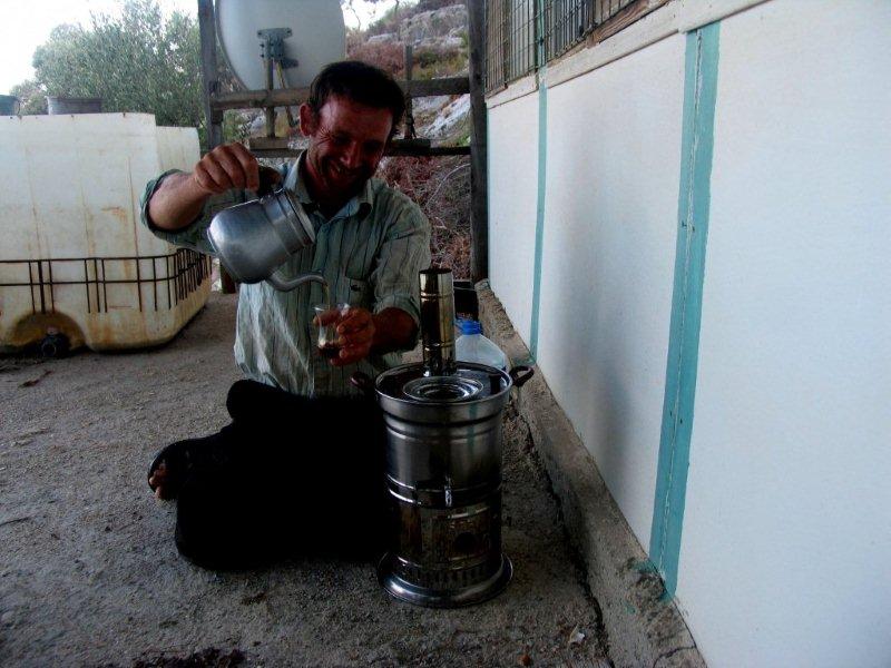 hromblitzender Ofen, mit Pinienzapfen unten richtig „befeuert“, oben der Samowar, der frische starke Tee wird mit heißem Wasser aus dem Mittelbauch verdünnt. Wir essen abends vegetarisch: Bandnudeln und selbst gekochte Tomaten-Gemüse-Sauce und geröstete Pinienkerne aus der Pfanne.